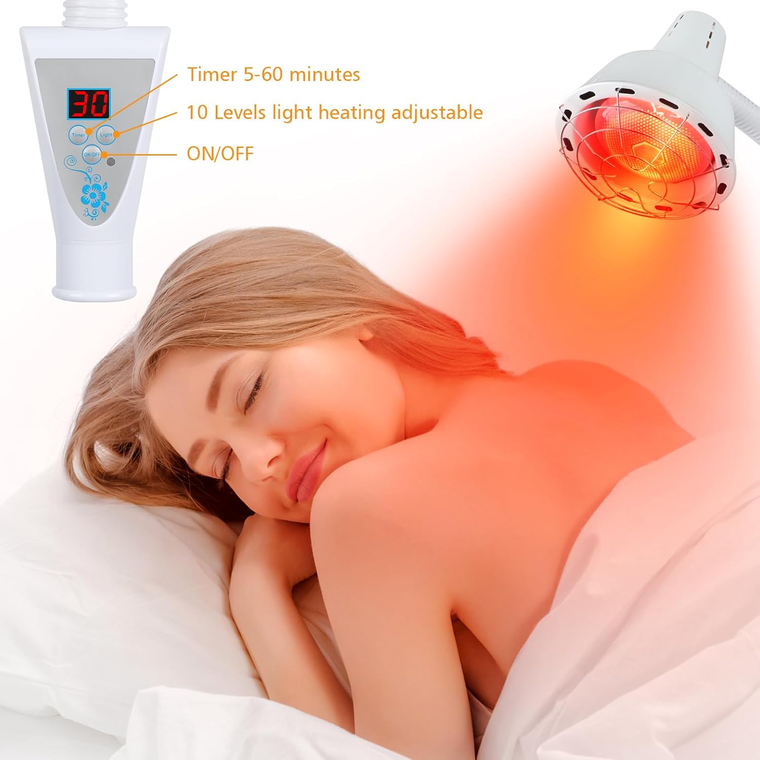 - [Easy to use] Timer 5-60 minutes, 10 levels light heating adjustable. This infrared light therapy device adopts metal body with simple and durable switches. The bracket is very stable, the height and angle of the light therapy device can be adjusted. It can be folded for easy storage.