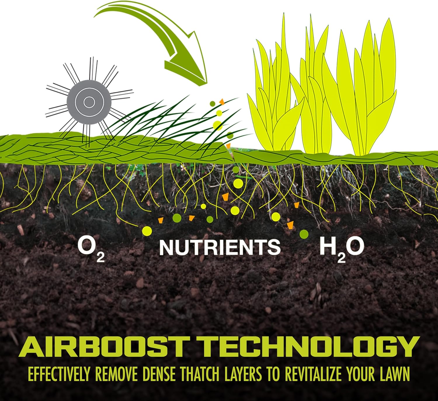 Innovative Airboost Technology: Enhance your lawn’s health with the Airboost Technology that maximizes thatch removal, ensuring superior airflow and nutrient absorption for your grass. This feature aids in promoting a lush, green lawn that is the envy of the neighborhood.