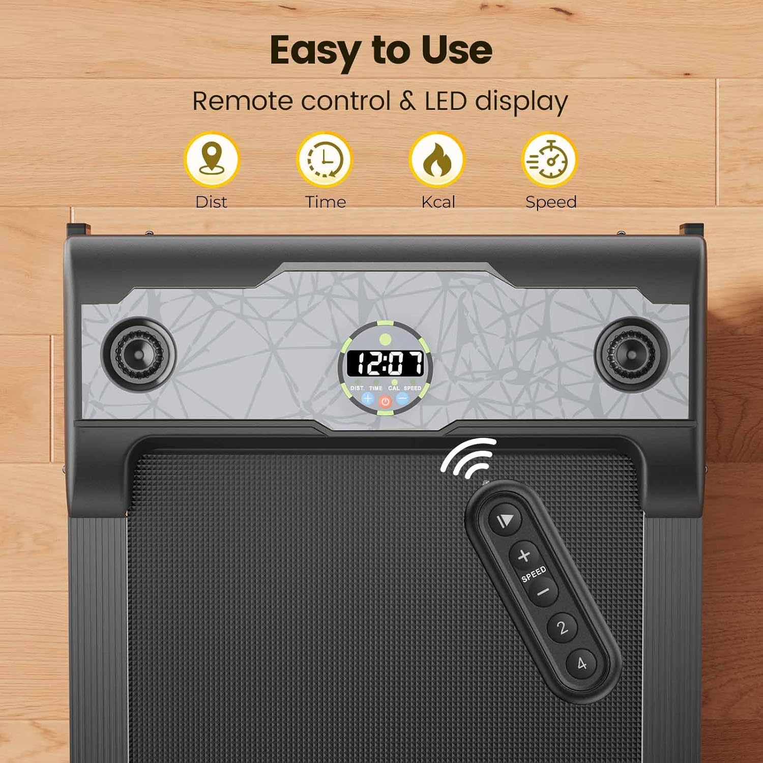 - Easy to Use: Time, calories, speed, distance are displayed on the HD LED display; A remote control allows easy adjustment of the speed and quick start and pause during work or exercise; Easy to get walking and running every day with the treadmill for home