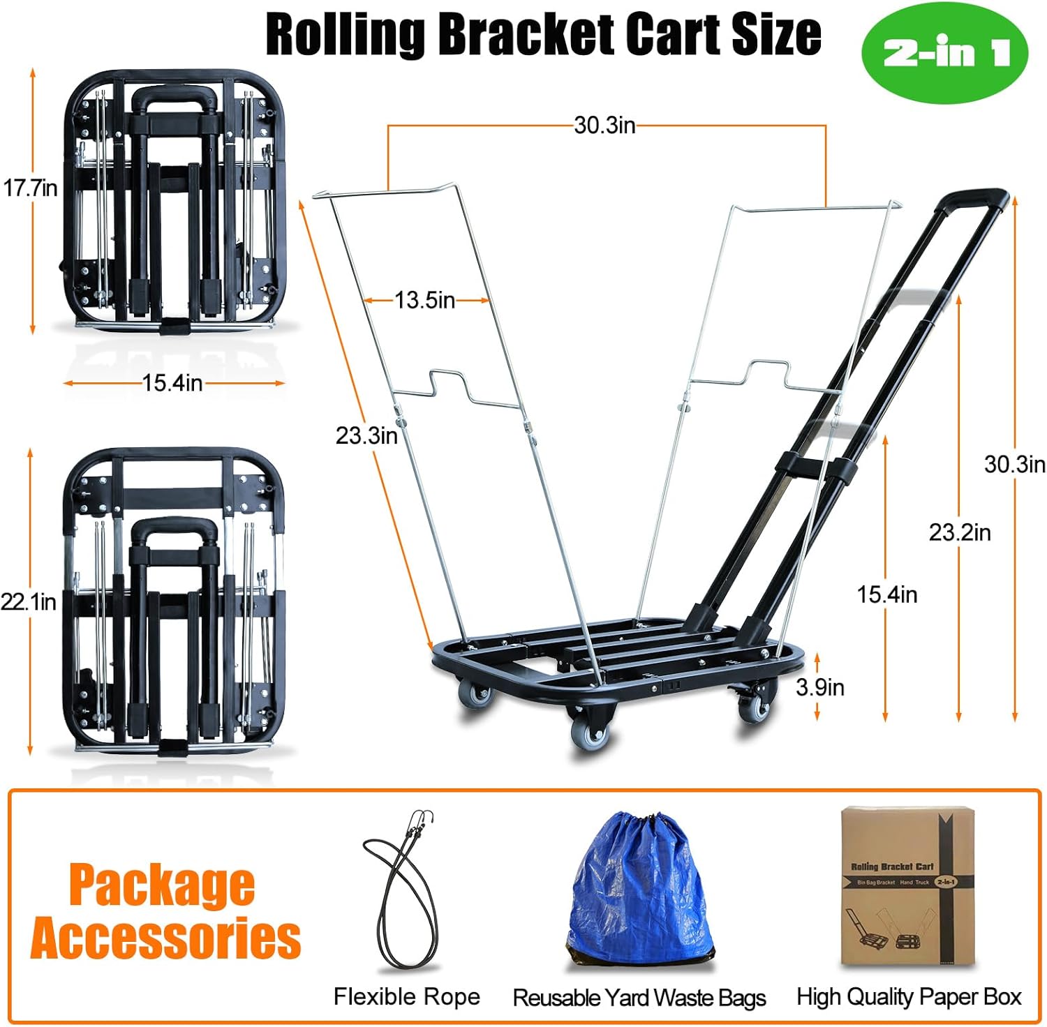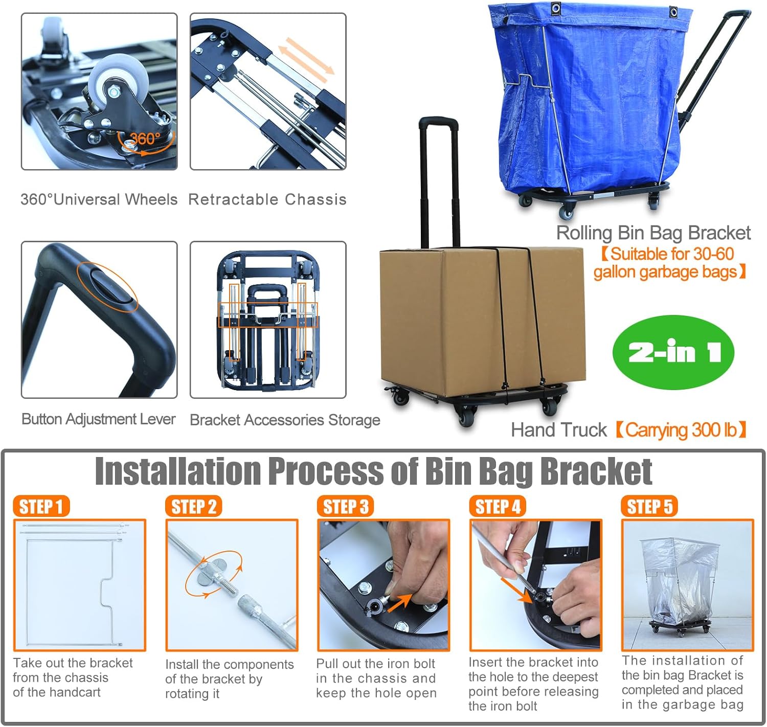 - ??Easy Installation and Storage??Rolling bracket cart, retractable and foldable. The accessories of the camping trash bag holder can be stored at the bottom of the car, and no tools are required for installation (directly inserted for use). The hand truck has a thickness of only 4in, making it convenient for storage and does not take up space.