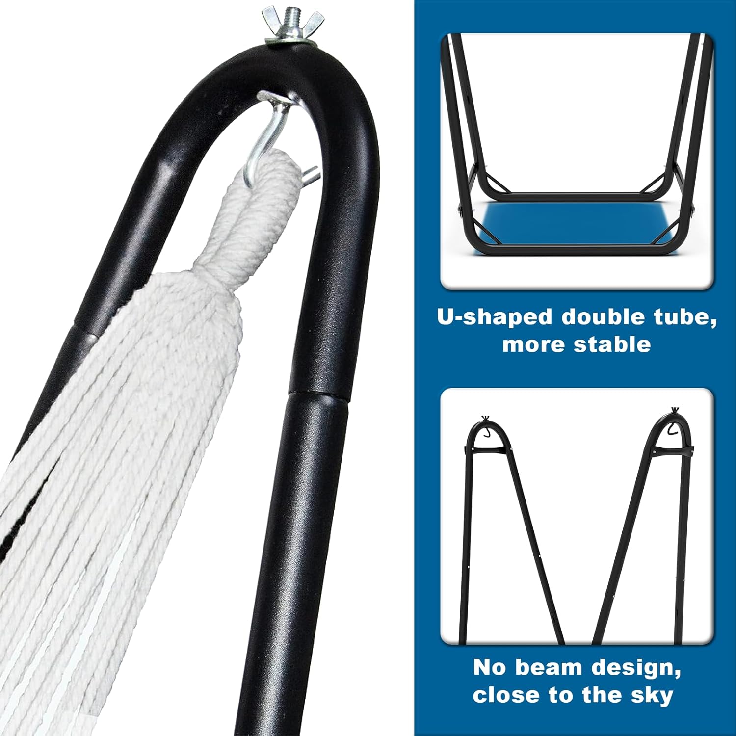 - Our new hammock chair with stand has a unique U-shaped structure and specially designed bottom brackets for enhanced stability and balance. The absence of an overhead beam design offers a wider field of view for a relaxed experience