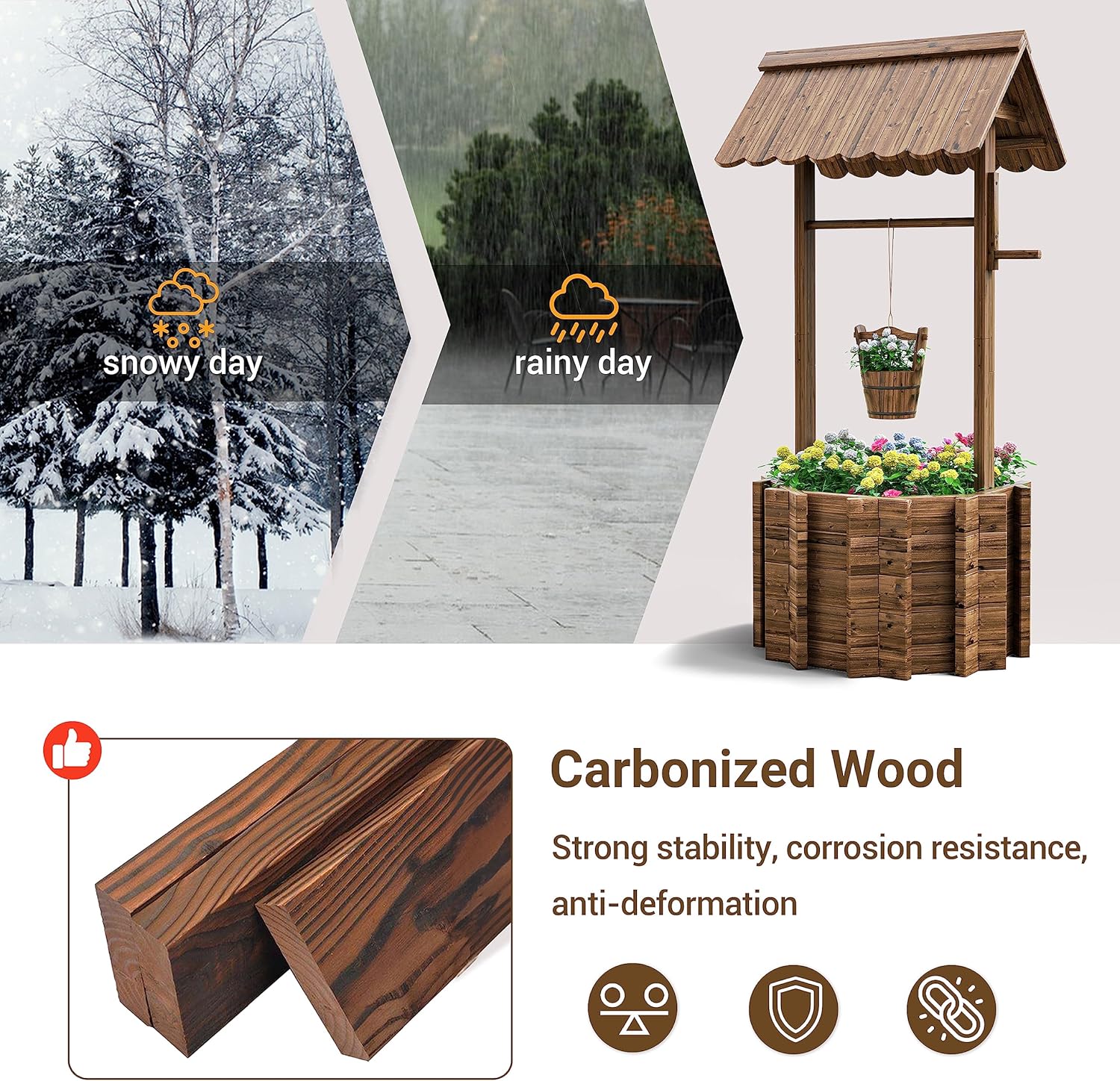- DEEP CARBONIZATION-More Solid: The wishing well are made of fir wood, adopt deep carbonization craft, processed at 200 degrees high temperature and high pressure. it can withstood the heat, rain and humidity, hold up for many years. The wishing well brown appearance is very pretty and rustic looking.