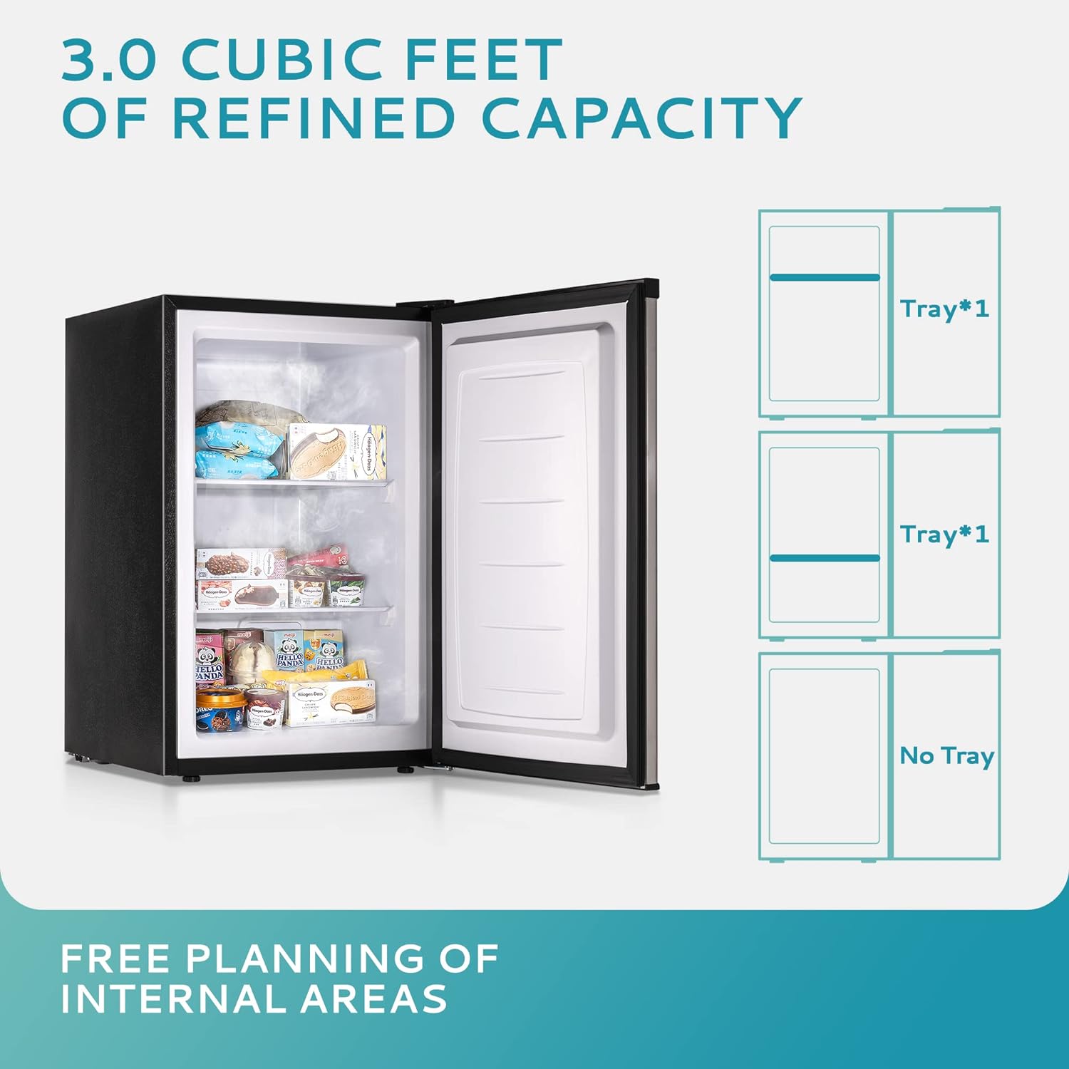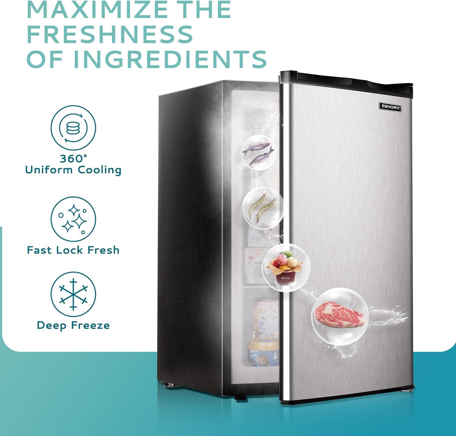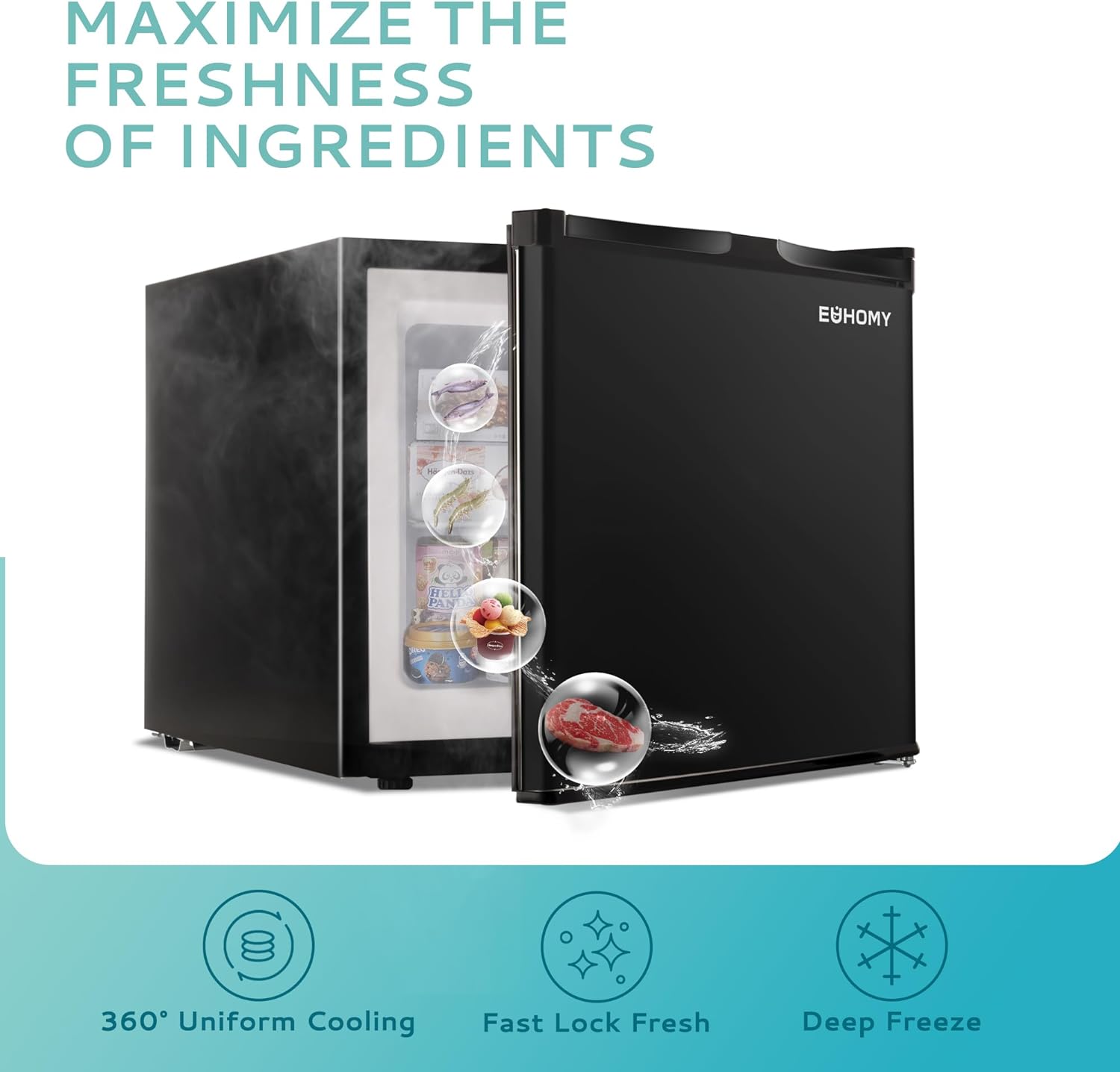• EUHOMY – RESPONSIBLE FOR YOUR FOOD – Euhomy’s mini freezer uses 3D refrigeration technology, and rapid cooling technology is good for food fresh and storage. The internal capacity (3.0 cu.ft) and the multilayer structure allow you to have more choices. It can not only provide ample storage space for food/fruit/vegetables/seafood/ice cream, but also prevent odor, allowing you to enjoy clean and odorless food all the time.
