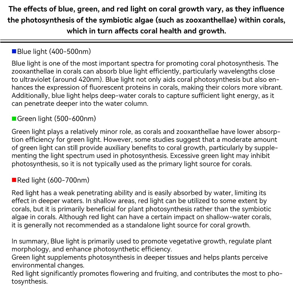 - Show the PAR of the blue, green, and red in the light seperately. Know the PAR of Blue that is very important for your coral growth, health, and coloration.