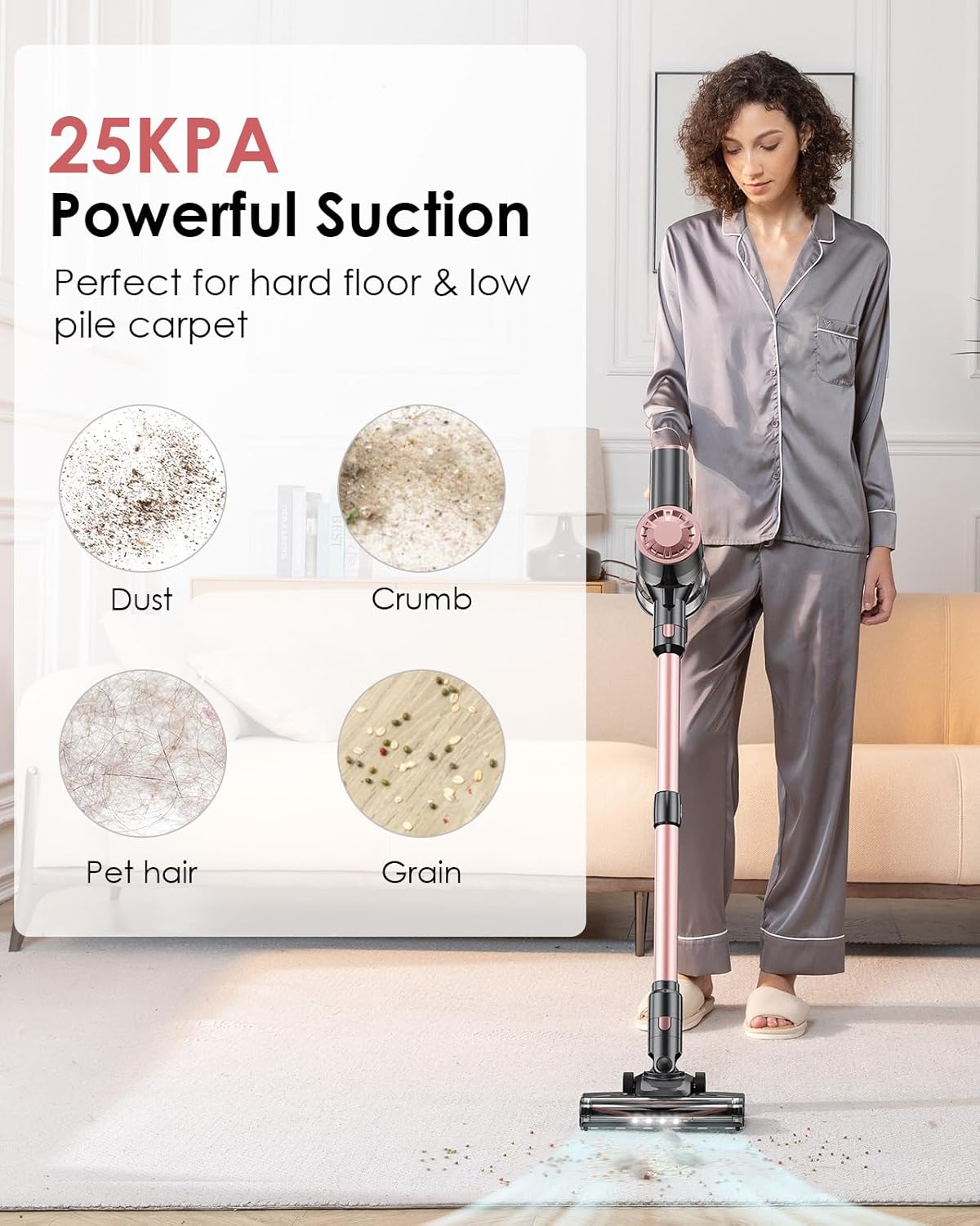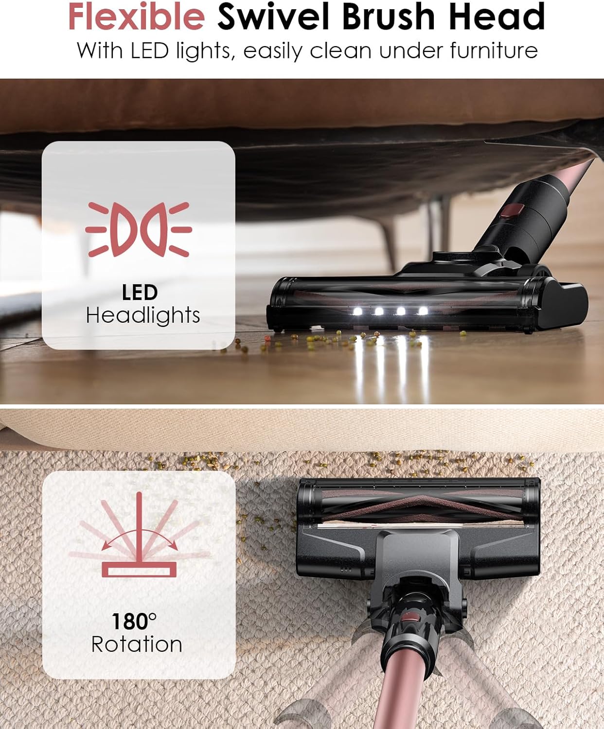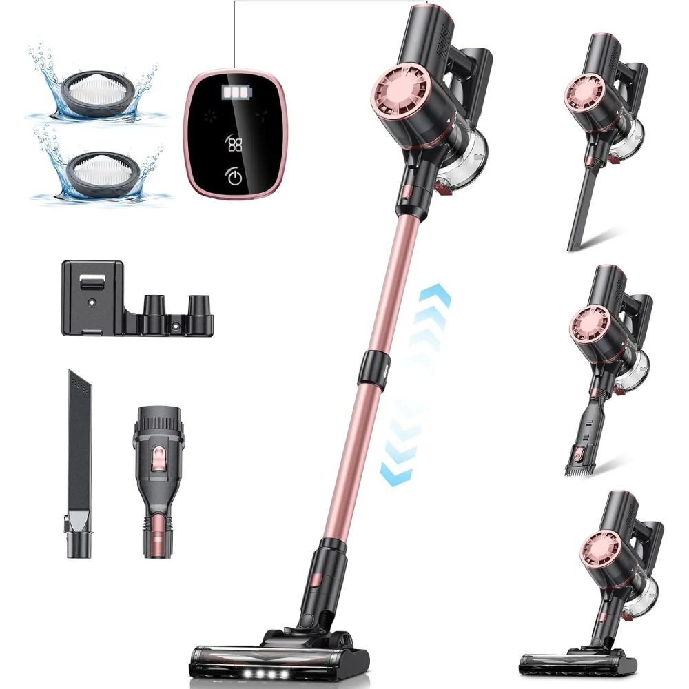 - ??No Hassle, Easy to Use??The hardwood floor vacuum brush head can rotate anytime between 90?? and 180??; the LED light is perfect for cleaning crumbs, dust, and pet hair in the dark; You can select suction mode or check the battery level on the LED smart display. Also with wall mounted storage rack, no need to worry about lost accessories.