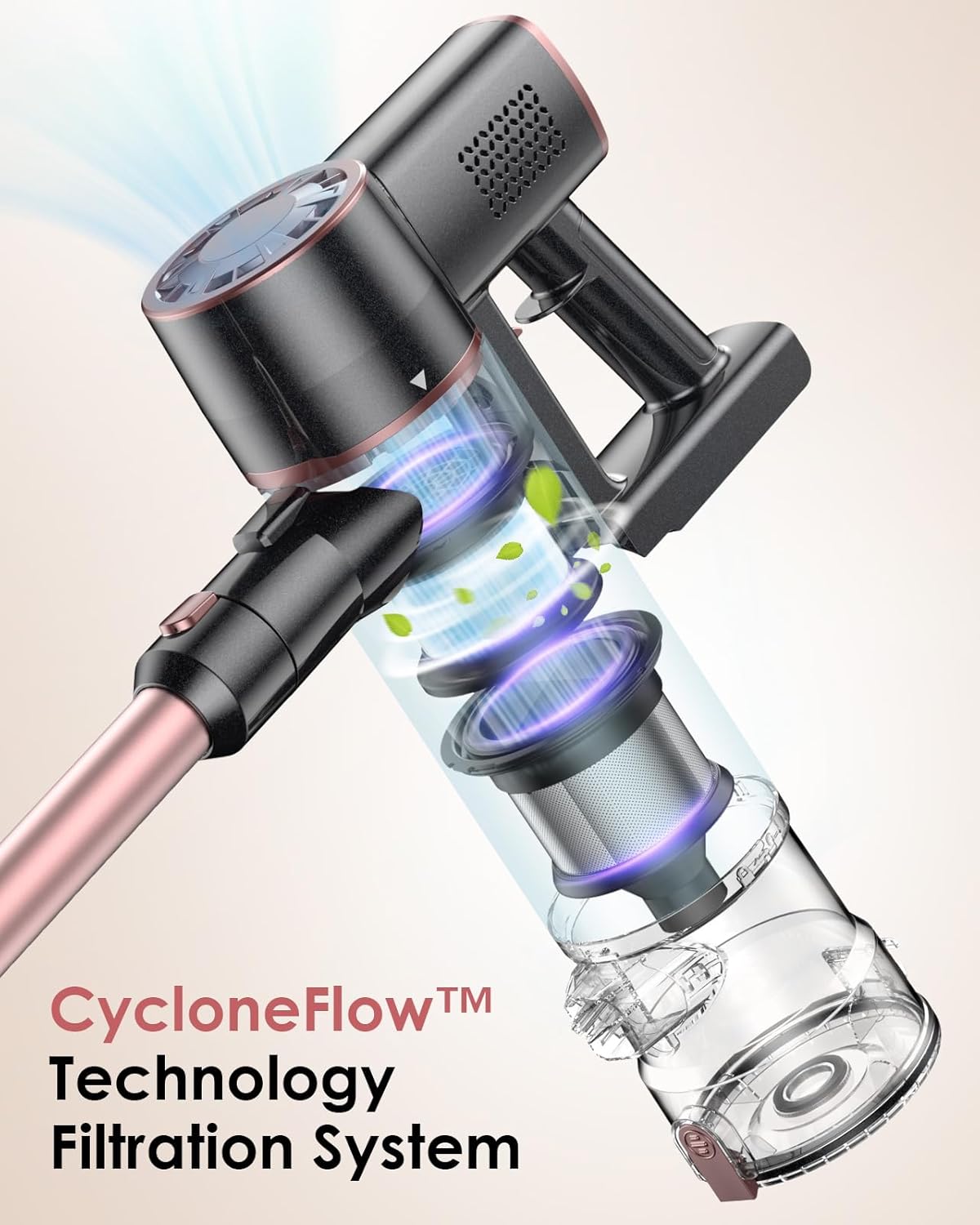 - ??Multi-cone Cyclone Filtration Technology??The household vacuum cleaners features a upper 7-cone cyclone air duct system and a lower cyclone filtration. Dust and gas will be separated rapidly by the strong centrifugal force generated by the cyclone airflow, and the H10 hepa filter can detect particles as small as 0.1um, resulting in a 99.97% purification rate.