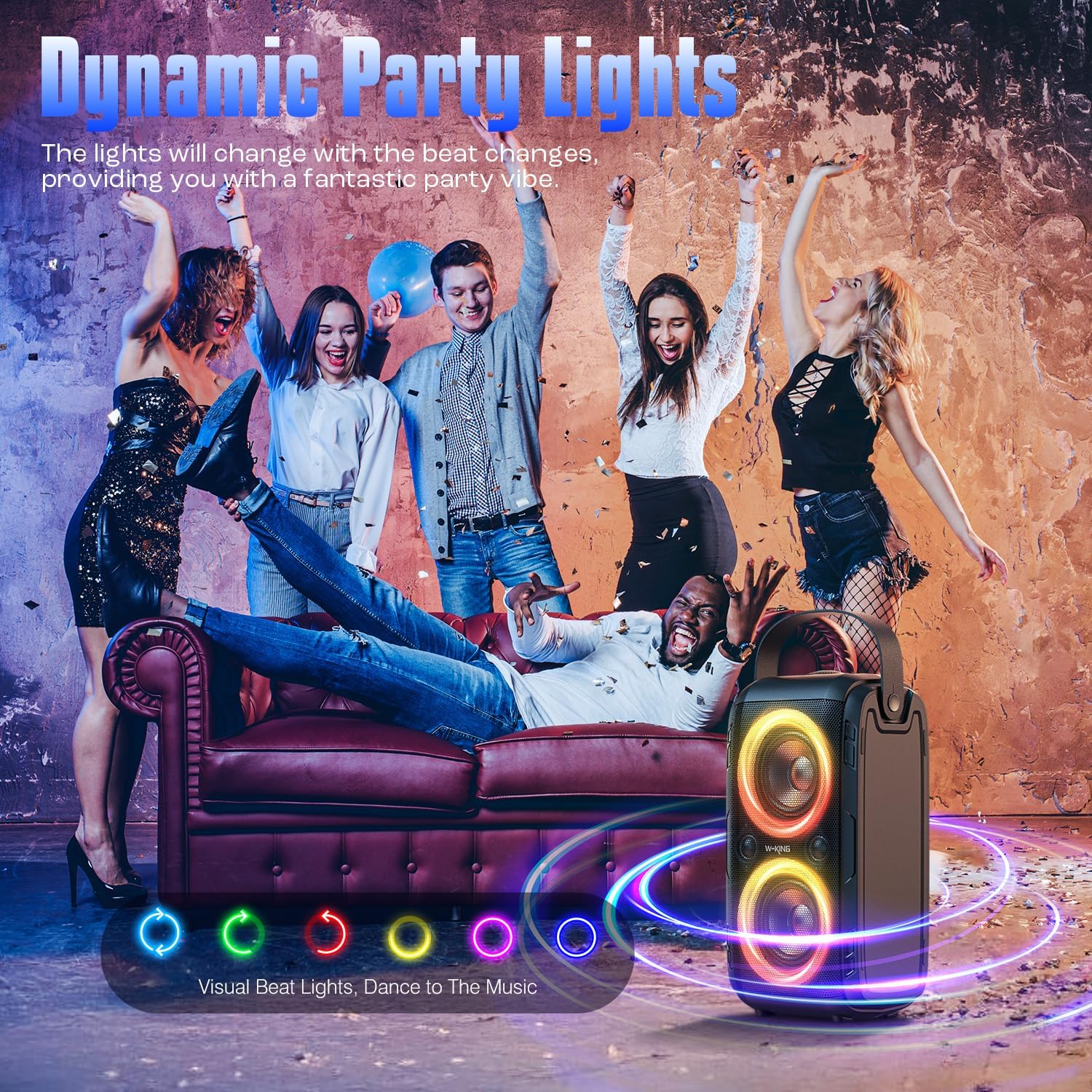 • VIBRANT MIXED COLOR LED LIGHTS & VISIBLE TUNES: Party bluetooth speakers portable wireless can switch different light rings according to the category of the song. The light ring has 7 different colors, and 6 light effects can be freely switched with the beat of the music. The portable speakers bluetooth wireless is rugged and sturdy, coupled with high-quality sound, to ensure a relaxed atmosphere at home or party, and enjoy the dual impact of vision and hearing, boosting more off your party.