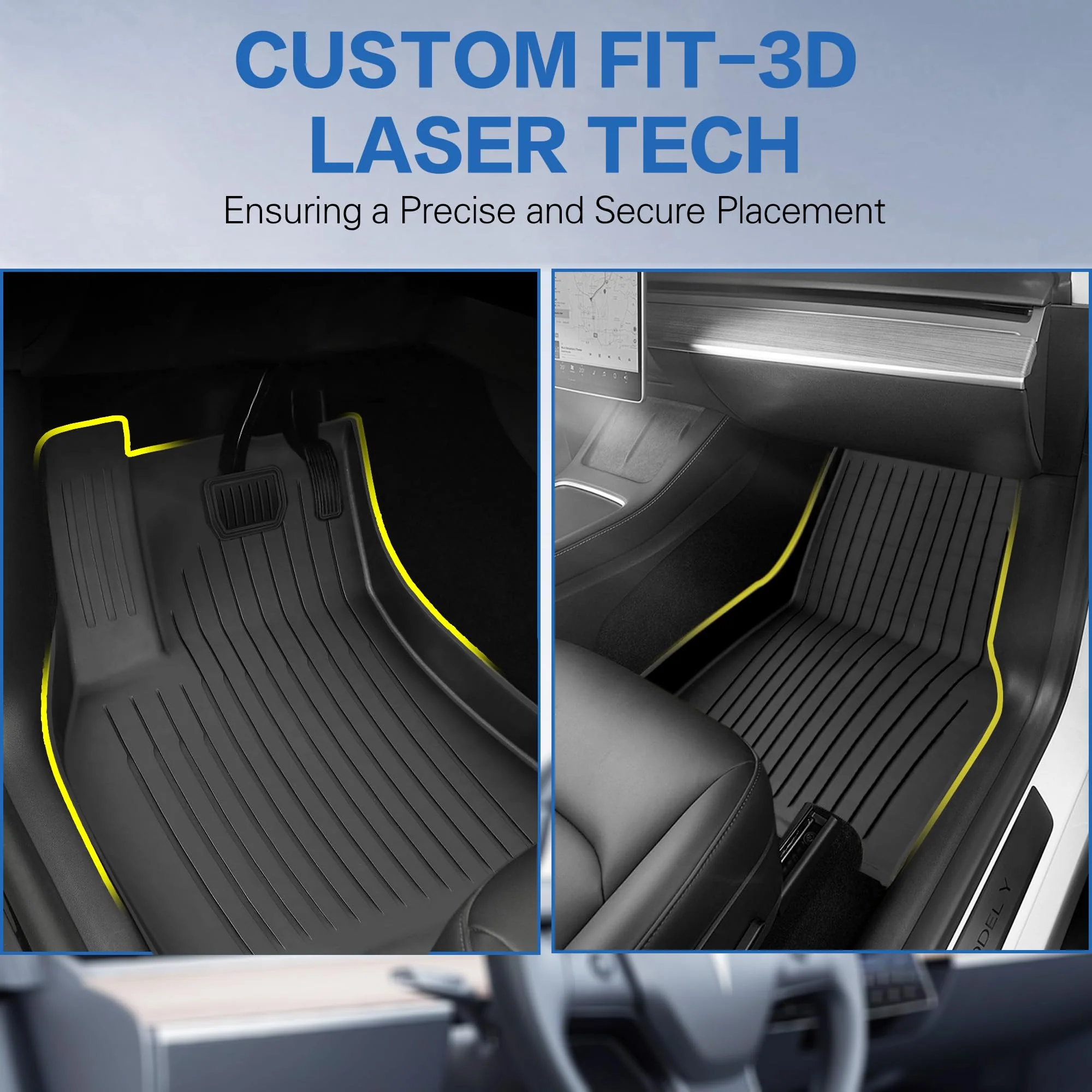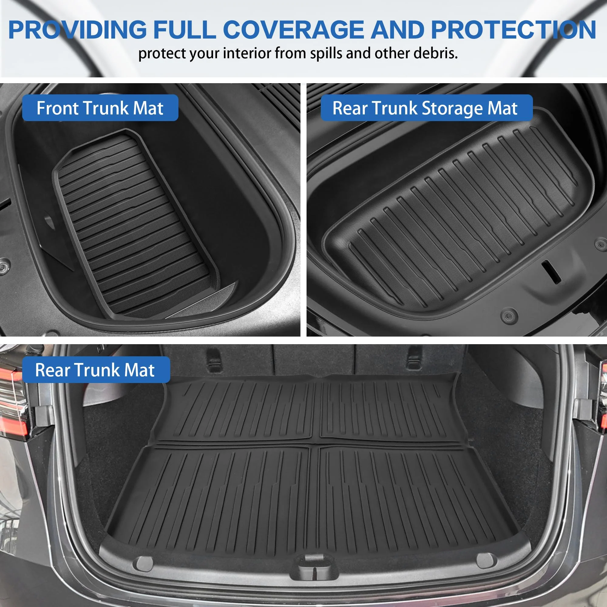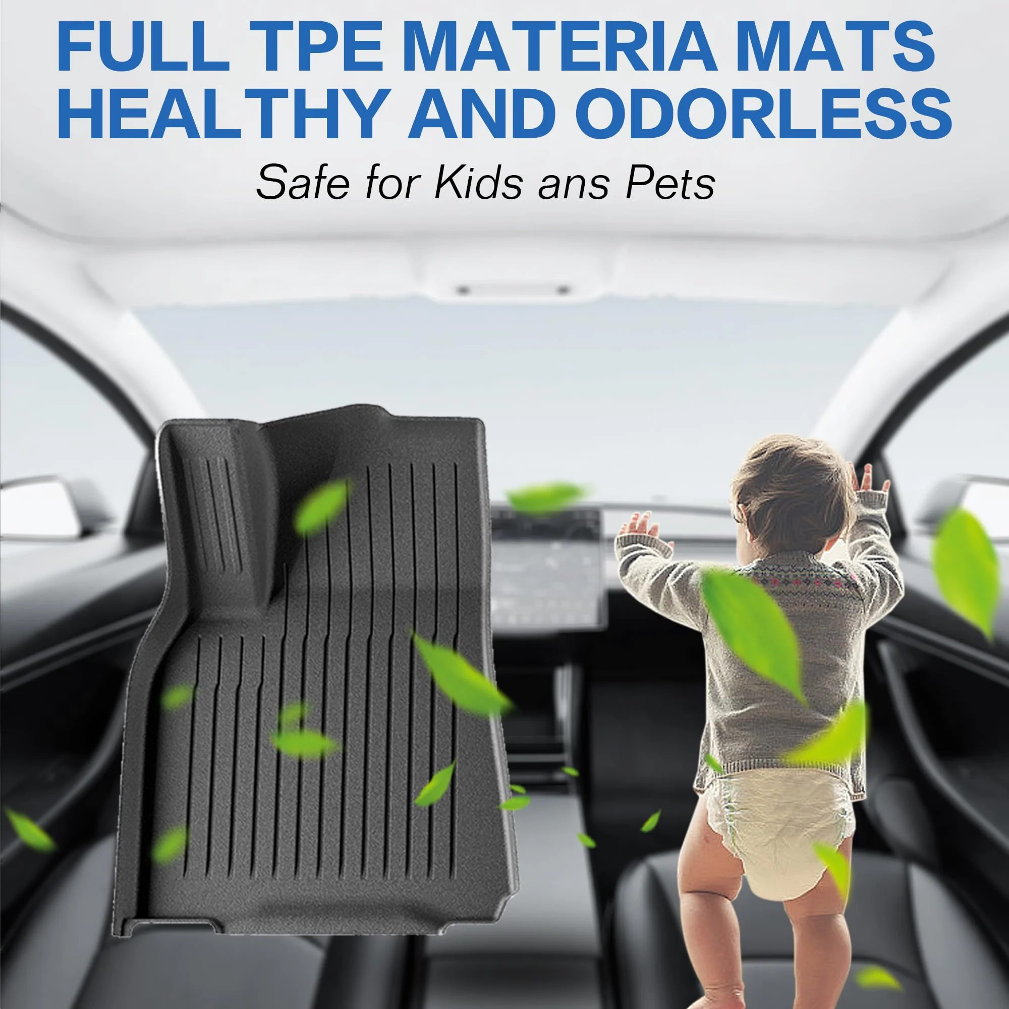 ??Fit for Tesla Model Y 2021 2022 2023 2024?? : Designed specifically for the 2021-2024 Model Y(5 seats), These all-weather mats are designed to fit your Model Y perfectly, providing comfort for you and your passengers, regardless of weather conditions.The custom fit ensures complete coverage of the floor area, including hard-to-reach corners and edges.NOTE: Does not fit on Model Y (7 Seater). ??Durable & Safe Material??: Made of Premium Quality Thermoplastic Elastomer compound TPE, providing 100% odorless, BPA Free, Non-Toxic, and eco-friendly coverage in all weather conditions, and you can safely leave your pet in the car. ??Full Coverage Protection??:6 mats set for the driver, passenger,rear seats, front trunk rear trunk and rear trunk storage. Design to offer maximum protection of the Tesla Model Y floors from spills, stains, dirt, mud, snow and etc. Raised sides give extra protection for spills and wet items. ??Easy Clean Maintenance??:Easy to clean and keep looking new.Extremely easy to clean with a water hose or towel.Constructed from superior quality materials, these mats will preserve the original look of your vehicle for years to come, with a snug fit and unbeatable durability.Textured skid-resistant surface helps keep your feet stable and secure, while their easy-to-clean design makes maintenance simple. ??AFTER-SALES SERVICE?? : Package Size??31.9*22.8*9.45inch. If there is any problem with the product, please feel free to let us know. We will solve the problem for you. Full Set includes 6 pieces:1x Driver Side Mat