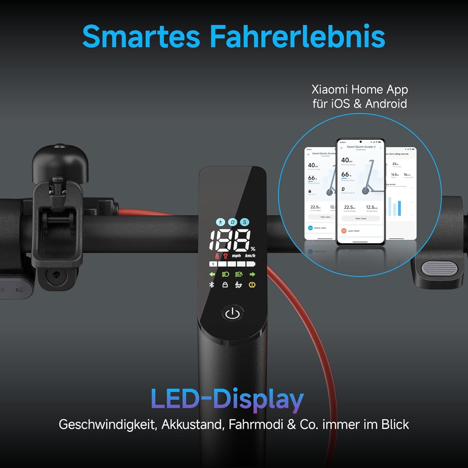 - LED display to display speed, battery level and driving modes