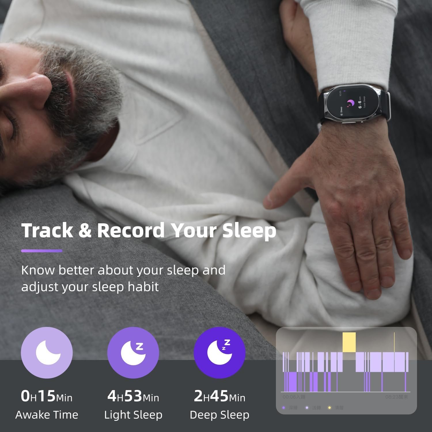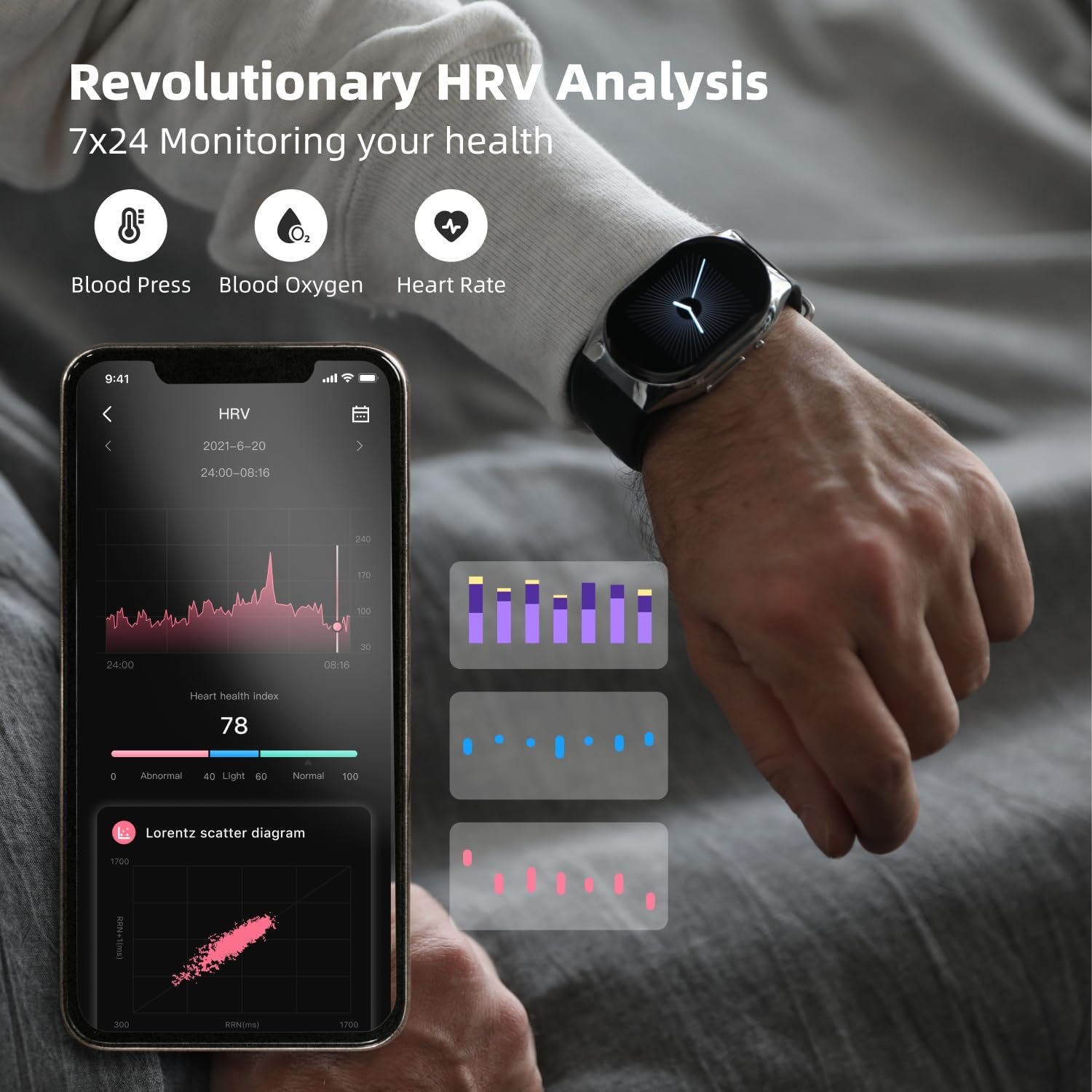 - ??Daily Health Monitoring with HRV??Our BP watch built in a PPG chip in the back, high-precision sensorsautomatically collect the body’s blood pressure, oxygen and heart rate data at night and analyzes, the results are presented as Lorenz scatter plots. You can check your HRV data every day through the watch to know more about your health condition and to help develop good habits.