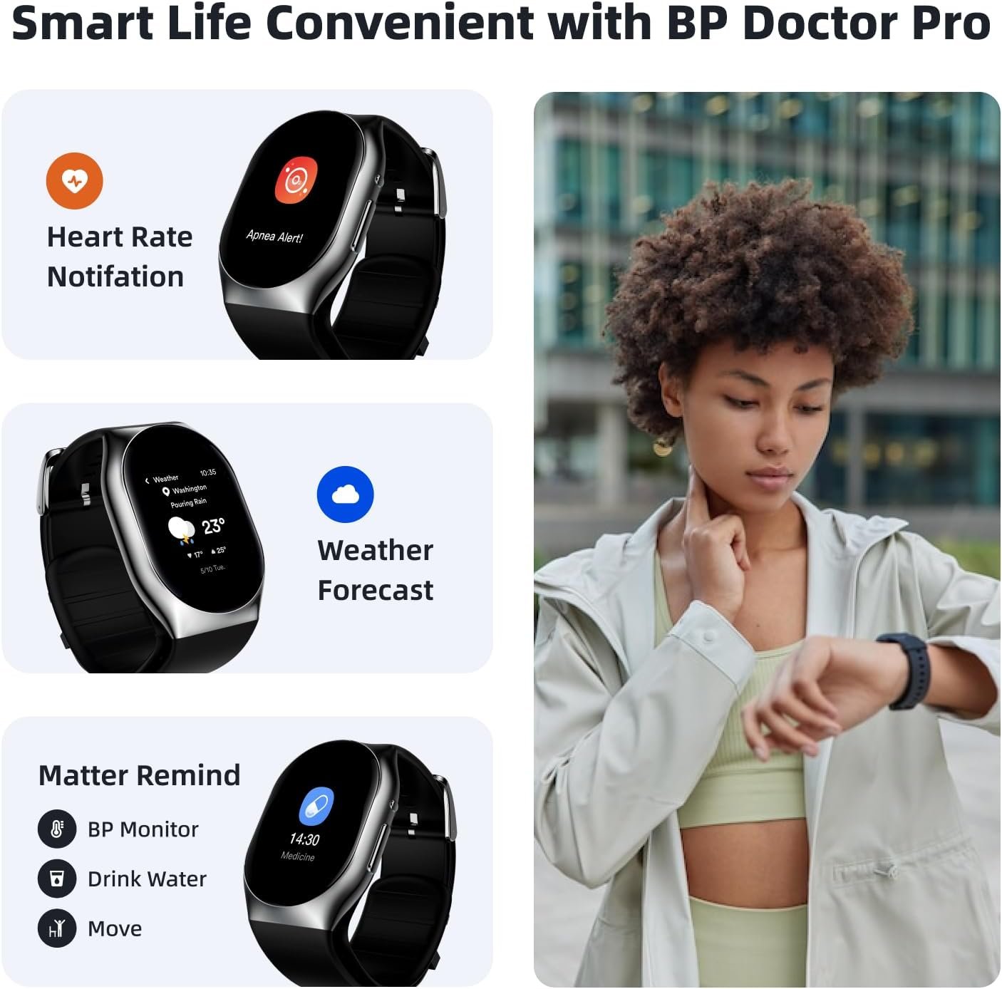 - ??Patented inflatable Cuff & High-Precision PPG Sensor?? YHE BP Doctor Pro equipped with innovative inflatable airbag through oscillometric measurement, you can measure your blood pressure anytime, anywhere. Our BP watch is also build in high-precision sensors, it features 24/7 tracker for Blood Pressure, Blood Oxygen, Sleep and Heart Rate. Setting up reminders for blood pressure monitoring, let BP Boctor Pro personal be youe personal health Manager.