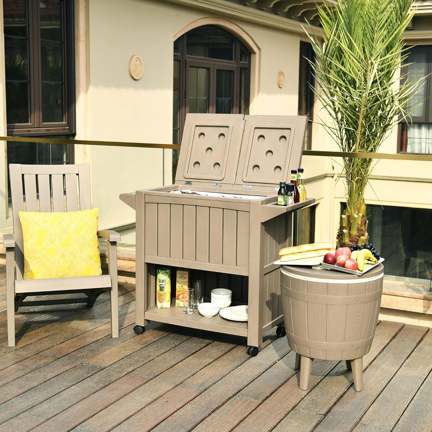 - LARGE CAPACITY- This patio cooler cart comes with an 85 qt/21 gallon ice bucket and open storage to chill your beverages for hours.