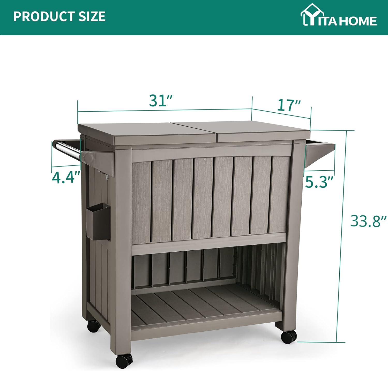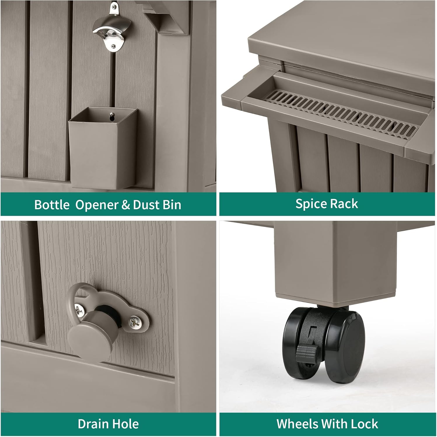- PREMIUM MATERIALS- Our Rolling Cooler Carts are built using all-weather resistant resin featuring natural wooden texture for great durability, protection against peeling and denting, a sleek look, and minimal touch.