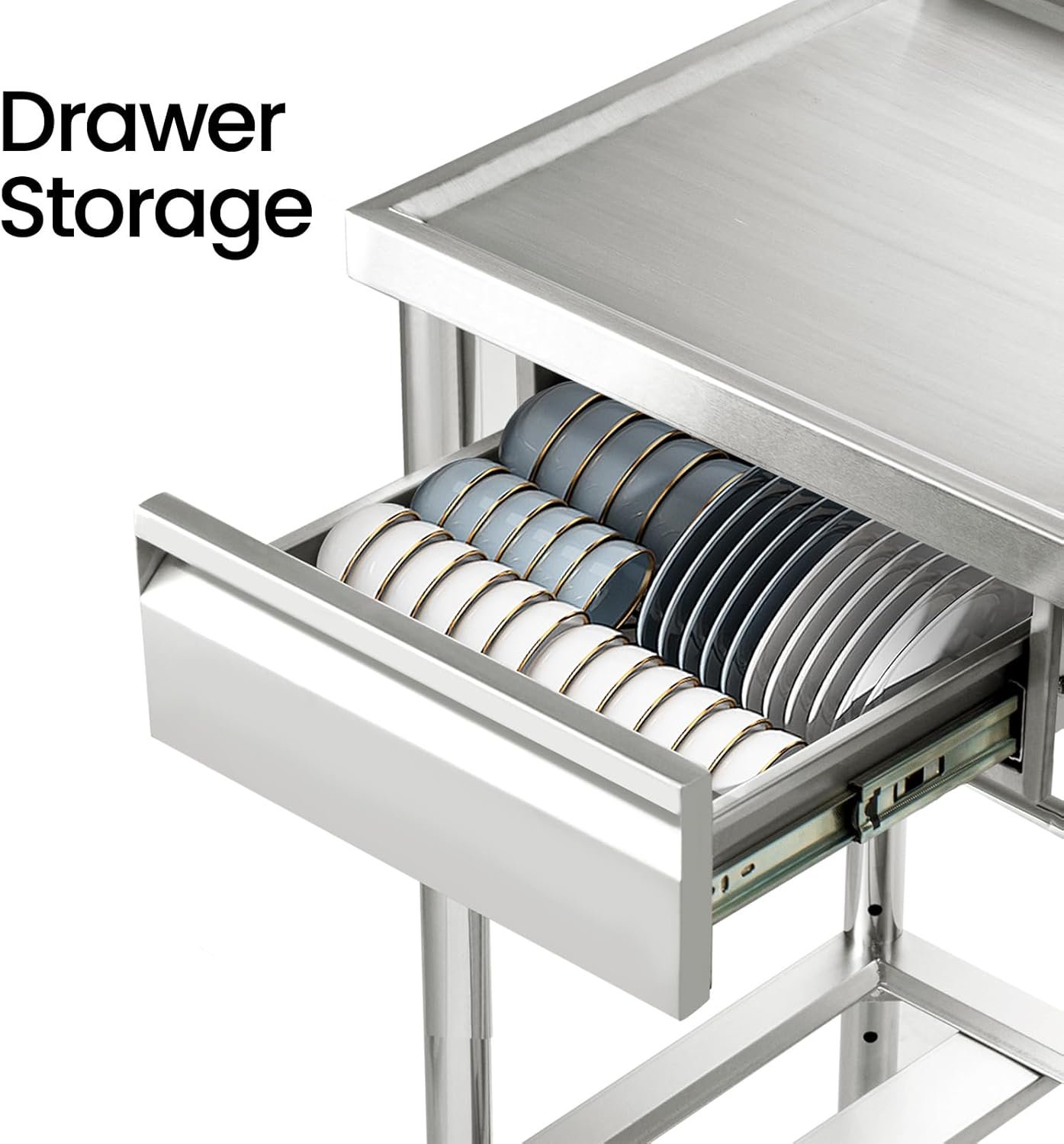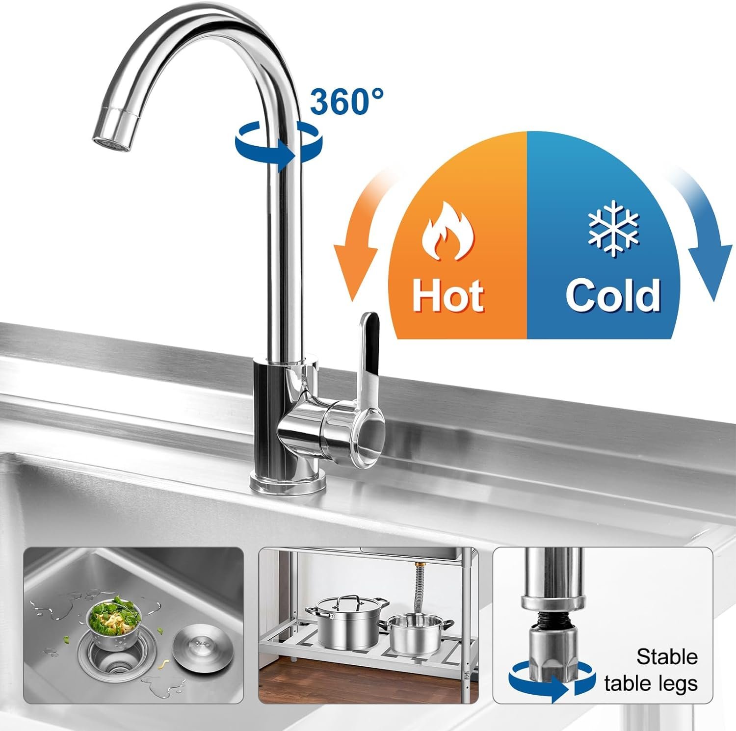 - UTILITY FREE-STANDING COMMERCIAL SINK: The YORKING stainless steel sink is equipped with hot and cold water inlet pipes, a gooseneck faucet that can rotate 360 degrees, a featured washbasin, drawer storage, a spacious drainage ditch, and a storage rack. Suitable for any commercial location.