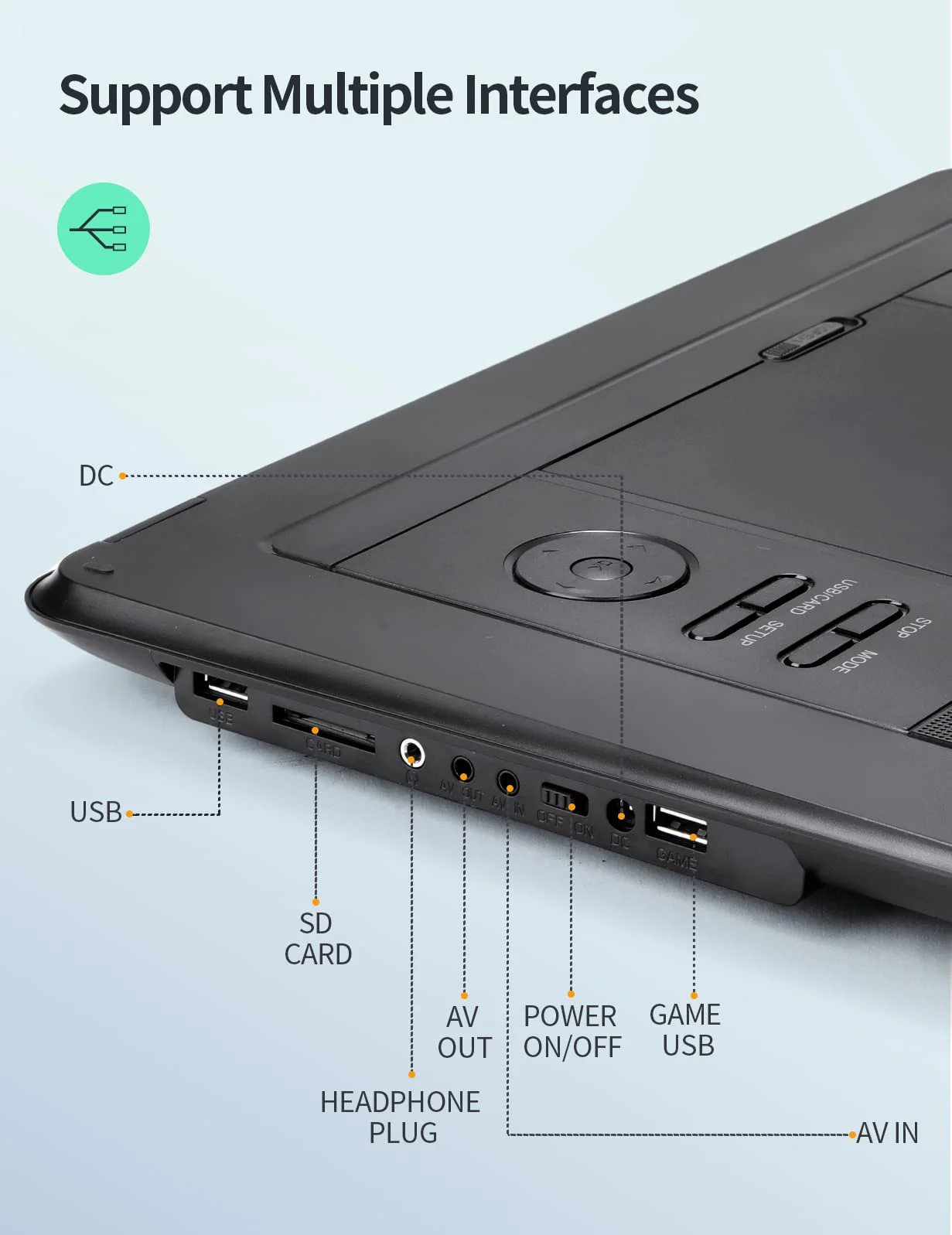 - Our portable DVD player has a 3-in-1 AV cable and interface, please use the AV cable to connect to the TV. If your TV only has an HDMI interface, please buy an HDMI and 3-in-1 AV cable adapter, so that DVD playback can be realized connected to the TV.