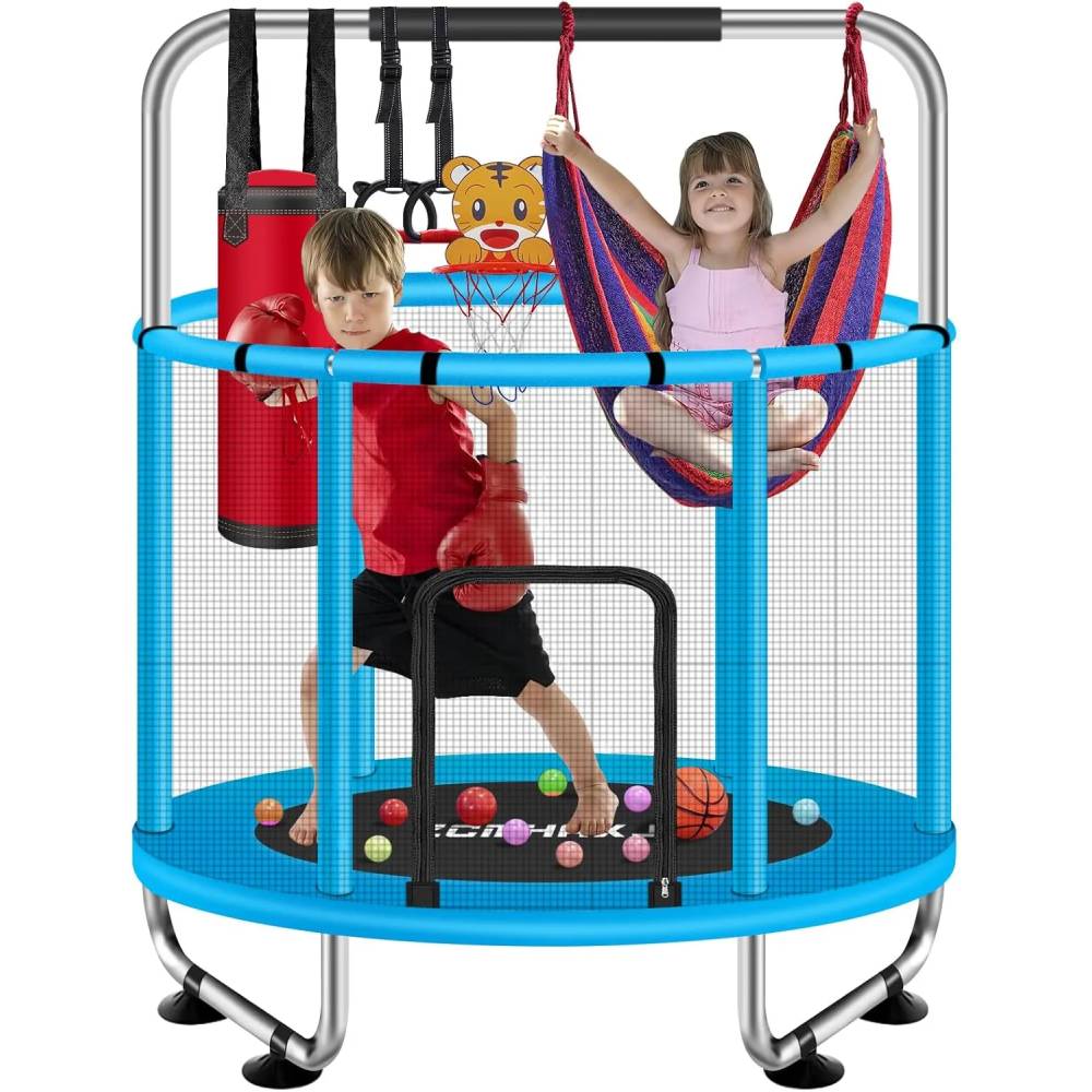 - ??MORE FUN WITH 7 TOYS??: Our toddler trampoline indoor comes with boxing gloves, a sandbag, rings, a swing, ocean balls, a basketball, and a hoop – 7 toys to keep your child engaged and active. This multi-sport combo will provide endless hours of fun, encouraging kids to put down their electronics and enjoy the joy of physical activity.