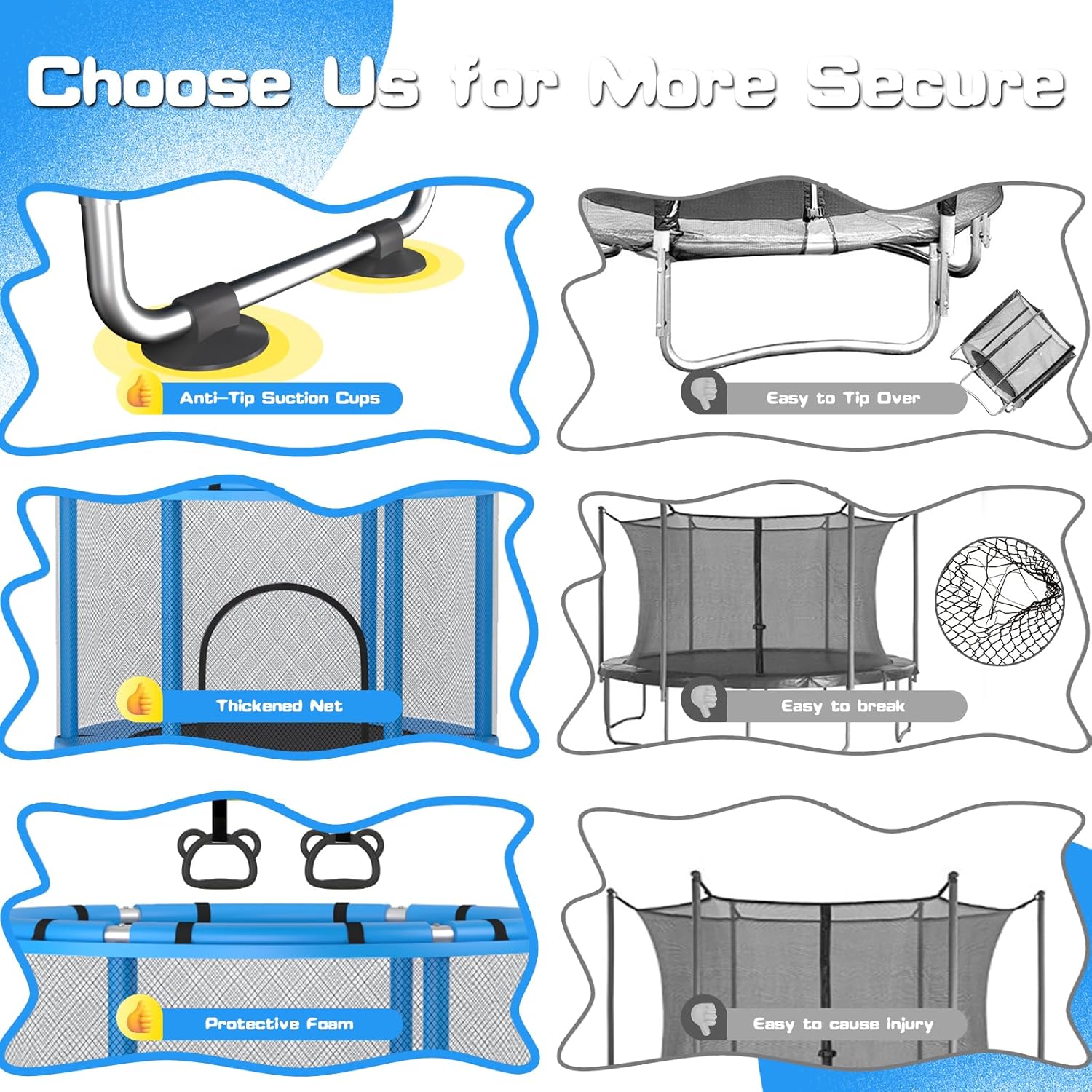 - ??SAFE & STURDY??: Indoor trampoline for kids is built to last, with a thickened steel frame, 3 U-shaped legs with non-slip suction pads, and a 360?? wrap-around safety pad. Plus, with dense safety netting and upgraded foam, it’s a robust and secure space for your little ones to bounce and play.