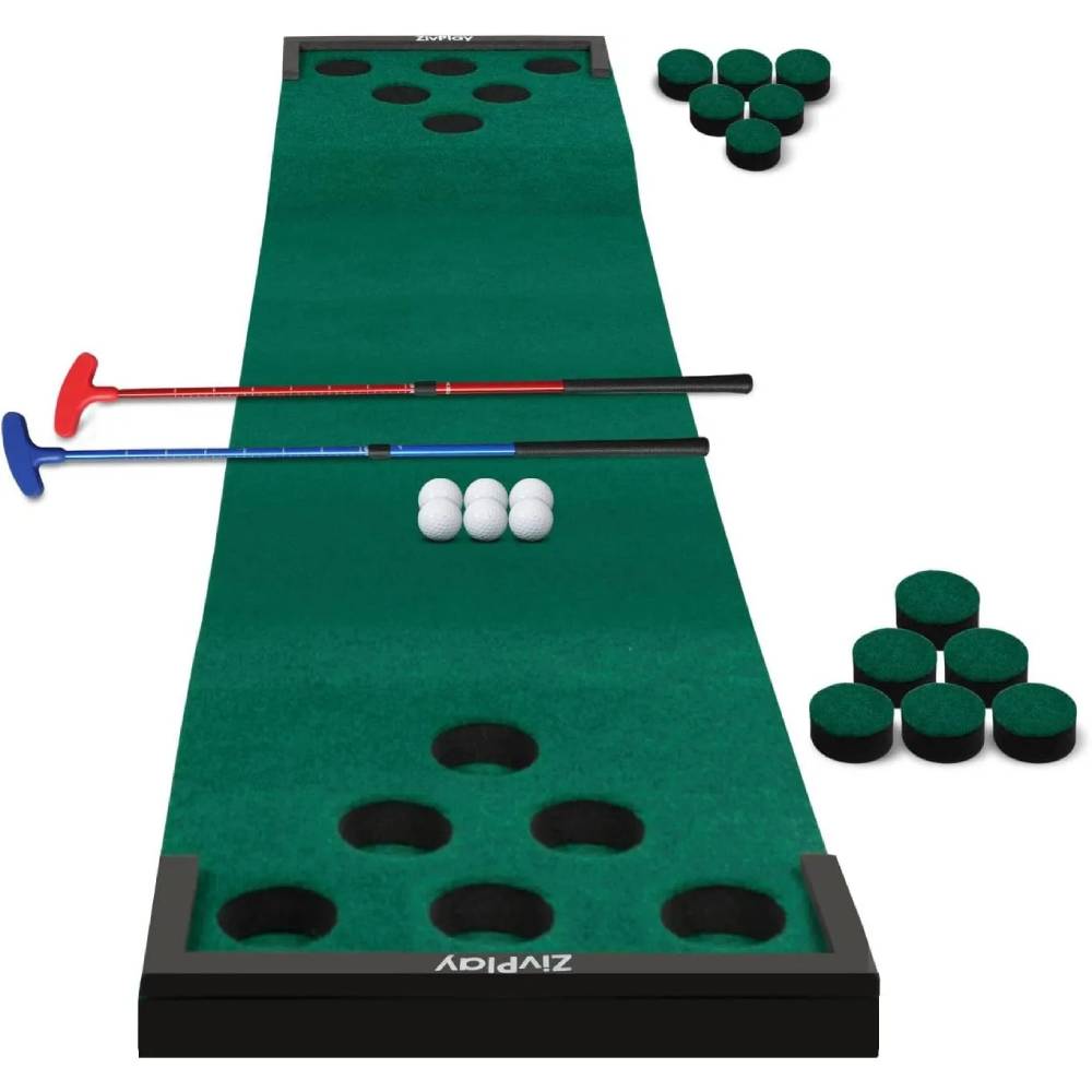 - ANTI SLIP, WRINKLE FREE MAT. 11 feet golf pong putting game mat with foam on both sides. Perfect golf games for adults indoor outdoor backyard!