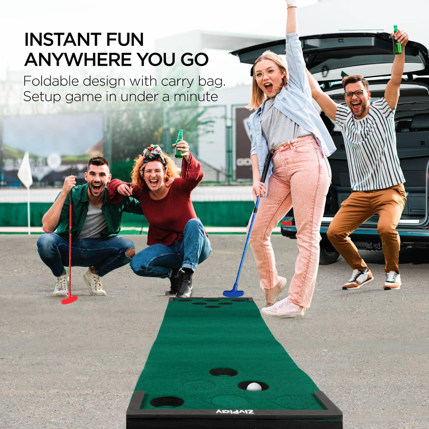 - PORTABLE and EASY SETUP. Foldable golf game set with storage bag. Setup this mini pong inspired golf in under a minute – Just unpack, unfold, and play!